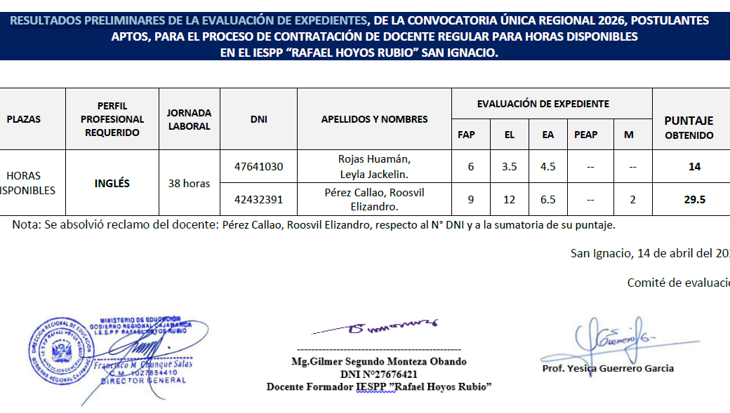 Se ha verificado los resultados preliminares de la evaluación de su expediente del docente Pérez Callao Roosvil Elizandro obteniendo como resultado de dicha verificación, se ha corregido el número de su DNI: dice 40600981 debe decir: 42432391. Asimismo, la sumatoria del puntaje obtenido, dice 21.5, siendo 29.5.