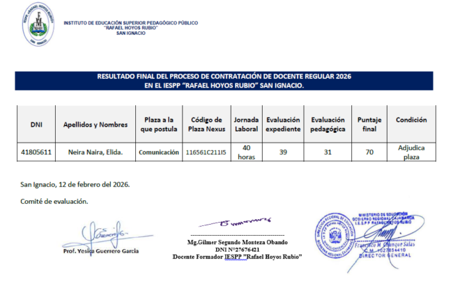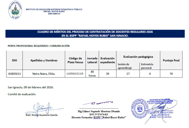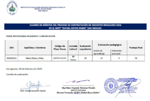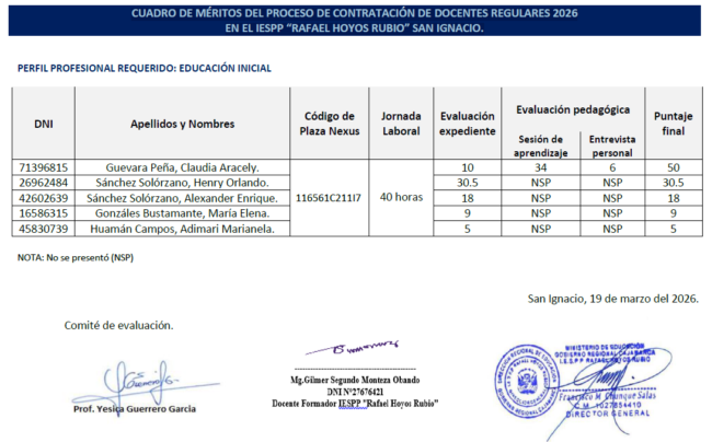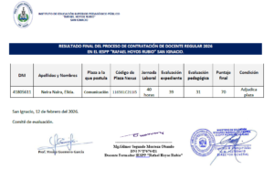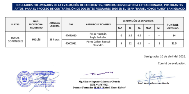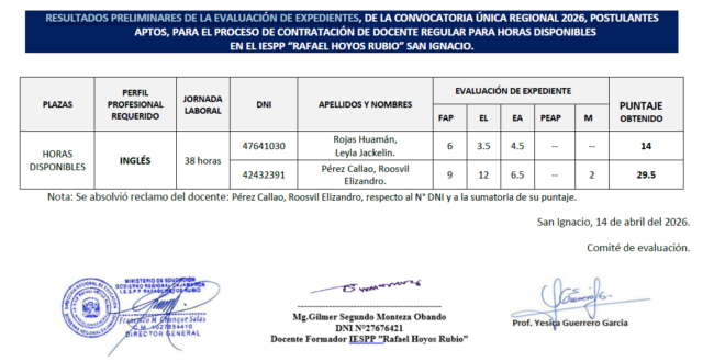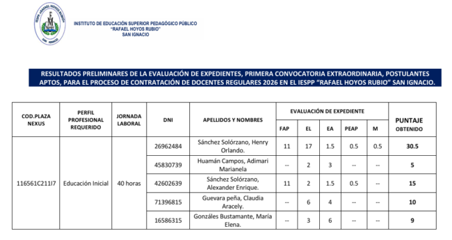 Se ha verificado los resultados preliminares de la evaluación de su expediente del docente Pérez Callao Roosvil Elizandro obteniendo como resultado de dicha verificación, se ha corregido el número de su DNI: dice 40600981 debe decir: 42432391. Asimismo, la sumatoria del puntaje obtenido, dice 21.5, siendo 29.5.